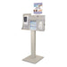 This touchless hygiene station combines a durable ABS plastic center (beige) with a powder‑coated steel floor stand and clear vertical sign holder for branding or instructions. The hinged locking lid secures essential consumables, while the port for an automatic hand sanitizer dispenser (not included) ensures hands‑free sanitization.