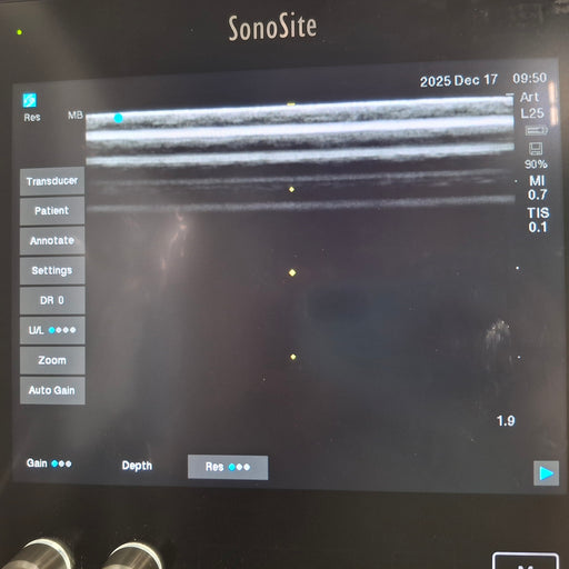 The SonoSite L25xp Ultrasound Probe is a linear transducer type that operates from 13 to 6 MegaHertz, and with a scan depth of 6 centimeters. It wo...