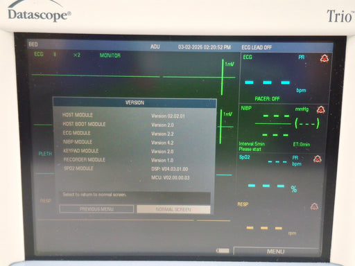 New in BoxNew out of BoxExcellentGoodPoorOEM: DatascopeMaterial: Trio Common Name: Patient Monitor Software Version: 2.02.01 Item Weight: 9 Serial Number: MC22326-J8 SKU#: Inv-00648085 Pow...